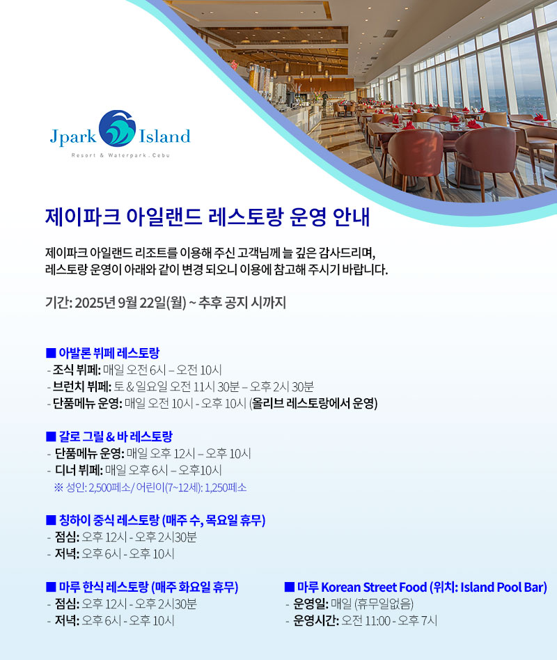 제이파크 아일랜드 레스토랑 운영 안내