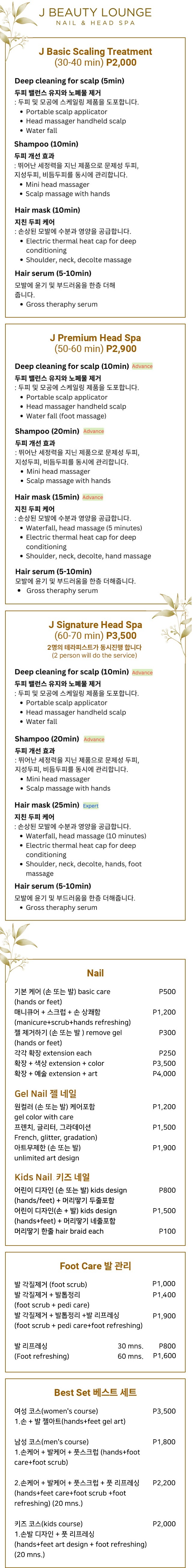 가족 모두를 위한 프리미엄 뷰티 힐링 공간 제이뷰티라운지는 정교한 네일 케어부터 편안한 풋 케어, 그리고 두피까지 풀어주는 프리미엄 헤드 스파까지 제공하는 토탈 뷰티 힐링 공간입니다. 휴양지에서의 여유로운 순간을 완성해줄 섬세한 케어를 경험해보세요.